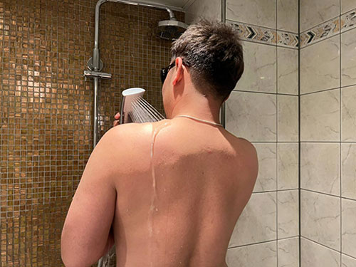 ■女性が到着してノックが聞こえたら、扉を少し開け女性から殺菌用ボディソープとうがい薬を受け取り、シャワーへ移動してください。